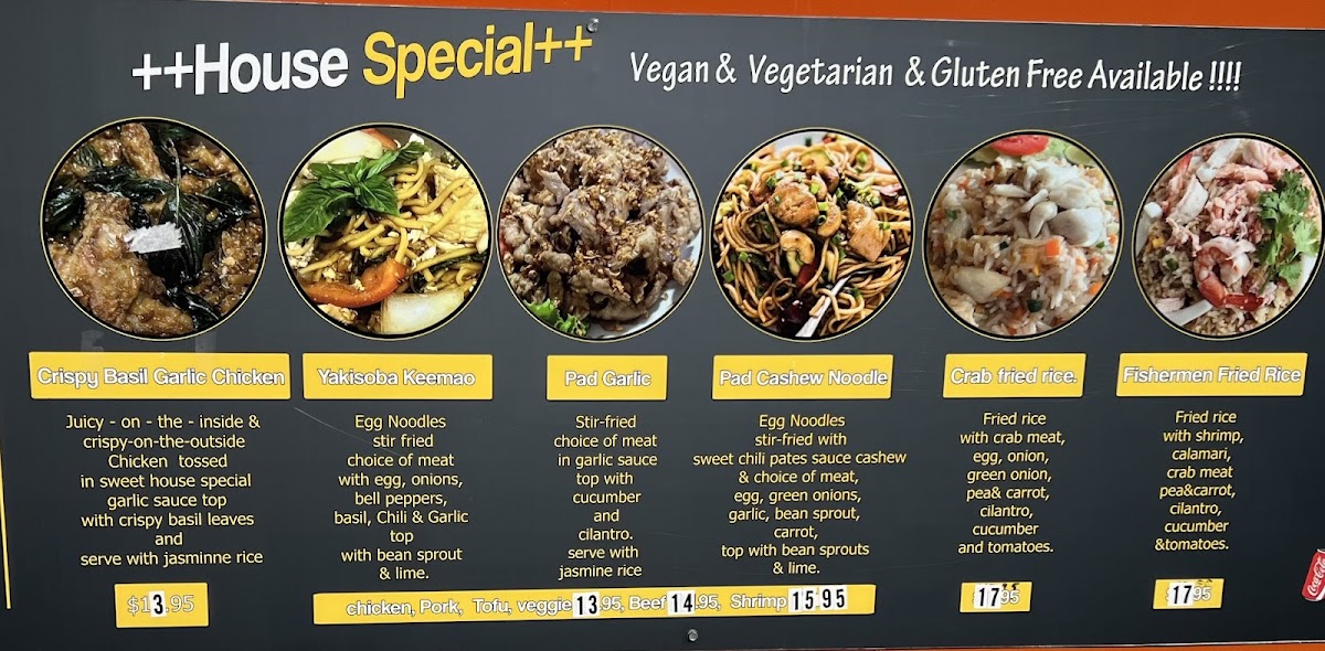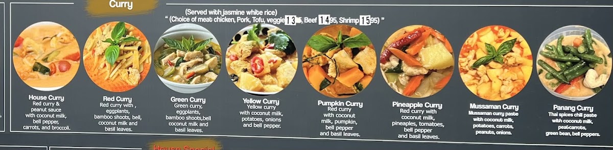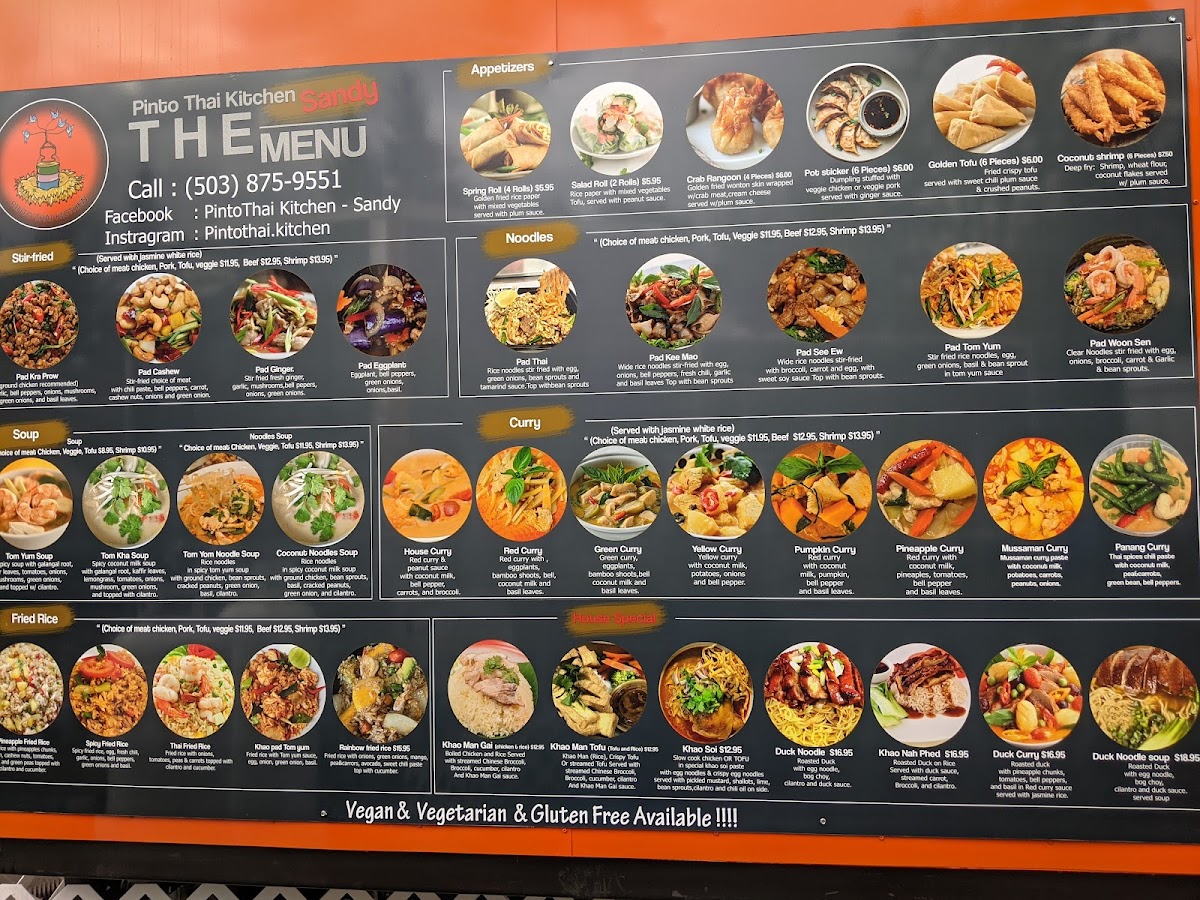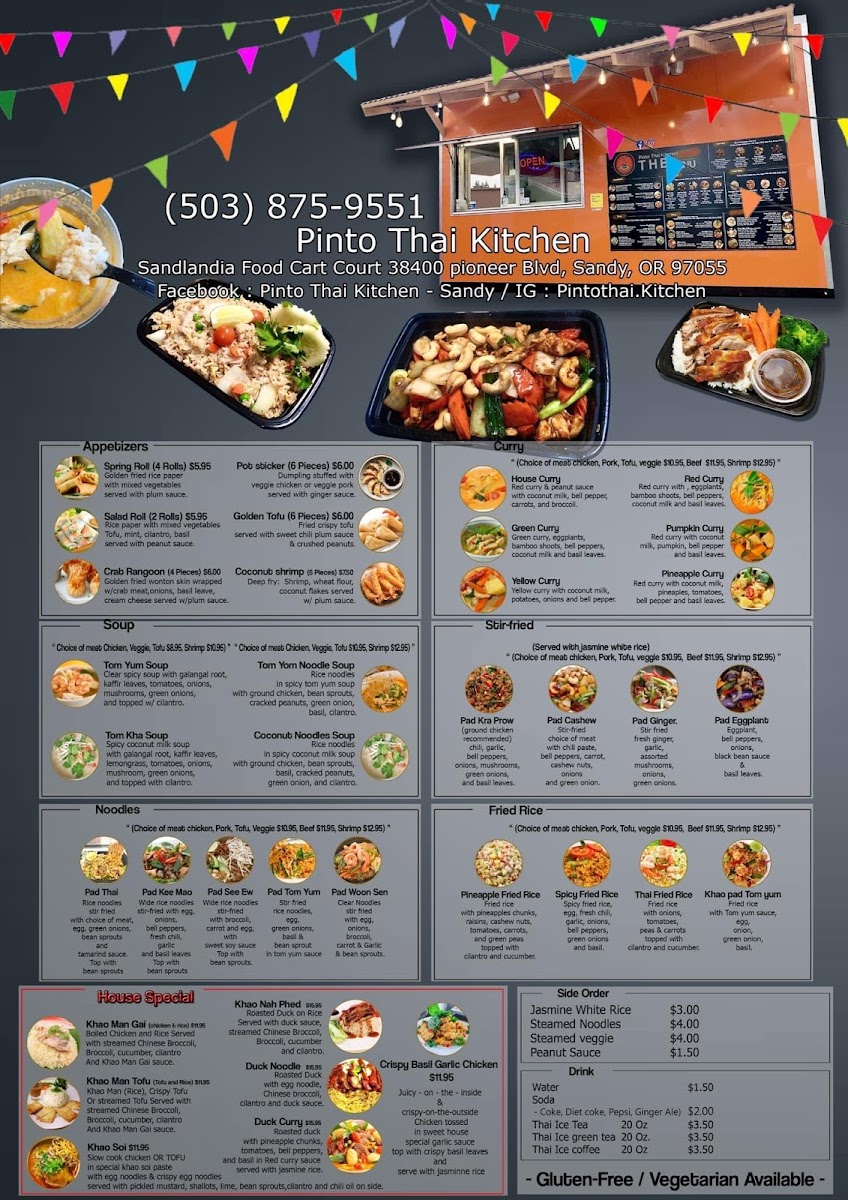 From a reviewer’s perspective, Pinto Thai Kitchen Sandy offers a well-rounded menu that highlights both beloved Thai staples and comforting house specialties. The appetizer selection sets a welcoming tone with classics like Fried Tofu, Potstickers, Salad Roll, Crab Rangoon, and Spring Roll, each offering a light and flavorful start. The fried rice options-Pineapple Fried Rice, Thai Fried Rice, Khao Pad Tom Yum, Spicy Fried Rice, and Fisherman Fried Rice-provide satisfying choices for diners who enjoy aromatic, wok-fried dishes. Curry lovers will appreciate the rich variety of Green Curry, Yellow Curry, Pumpkin Curry, Red Curry, and Pineapple Curry, each offering its own balance of spice and creaminess. The house specials, including Duck Curry, Khao Man Tofu (Tofu And Rice), Khao Nah Phed, Duck Noodle, and Khao Man Gai (Chicken & Rice), stand out as hearty, signature options that showcase the kitchen’s depth of flavor. Soups like Tom Kha Soup and Tom Yum Soup deliver warm, aromatic comfort, while stir-fried favorites such as Pad Eggplant, Pad Kra Prow, Pad Cashew, and Pad Ginger add savory variety. Noodle dishes-including Pad Kee Mao, Pad Thai, Coconut Noodles Soup, Khao Soi, and Pad See Ew-bring a satisfying mix of textures and spice levels. Simple but essential sides like Peanut Sauce, Rice, Steamed Veggie, and Steamed Noodles complement any meal, and beverages such as Thai Ice Tea, Thai Ice Coffee, and Thai Ice Green Tea round out the experience with refreshing sweetness. Overall, the menu is diverse, inviting, and crafted to satisfy a wide range of tastes.